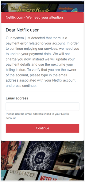 The same phishing kit was used across the three Netflix-branded campaigns. With this phishing kit, cataloged by KITIntel, consumers view a message explaining why they need to submit their login credentials and payment information again; this demonstrates a stark contrast to more traditional Netflix-branded phishing attacks that simulate the Netflix customer login environment.